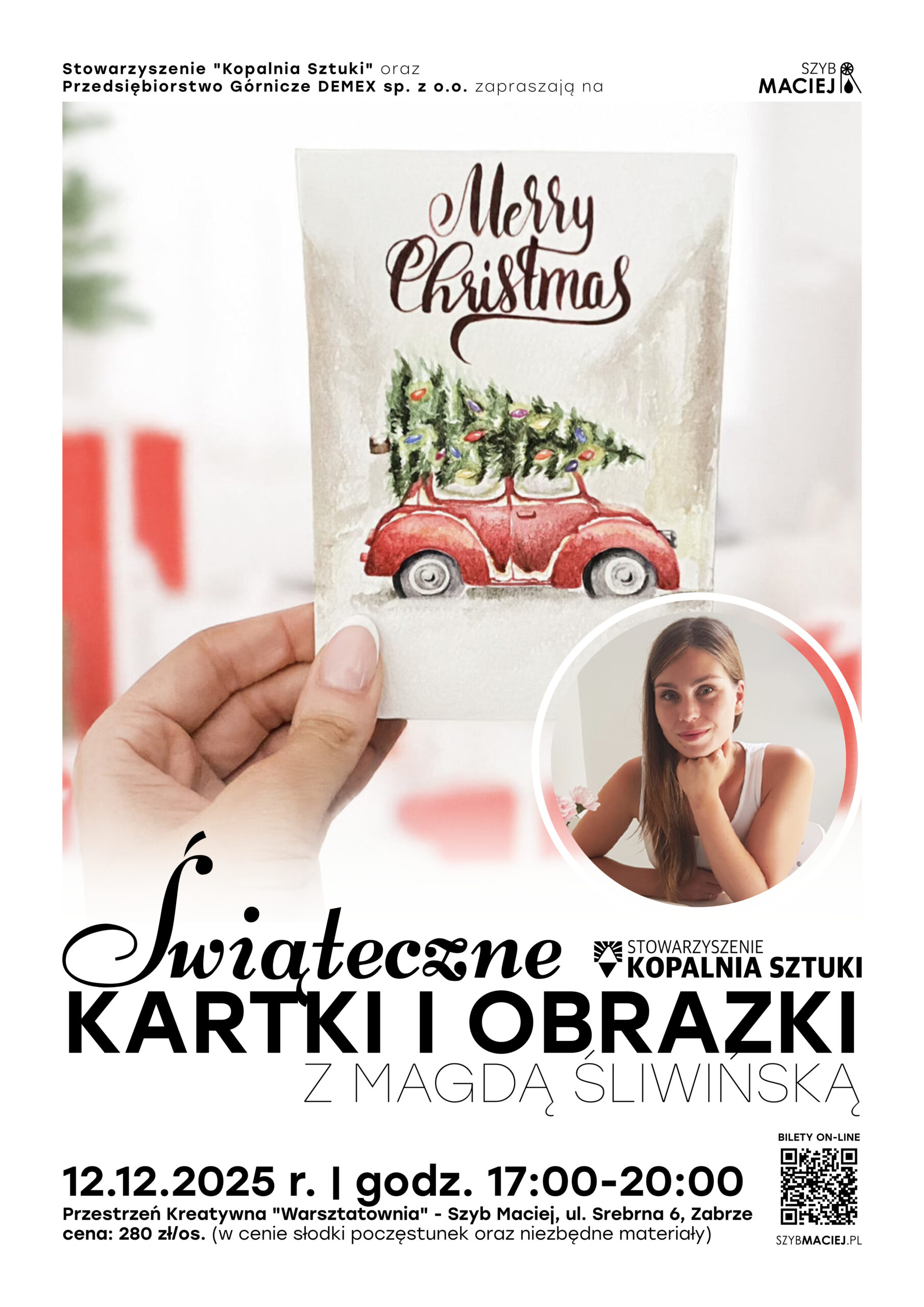 Wydarzenie “Warsztaty – Świąteczne kartki i obrazki” odbywa się 12 grudnia 2025 roku w godz. 17.00-20.00 w Przestrzeni Kreatywnej “Warsztatownia” na terenie Szybu Maciej w Zabrzu przy ul. Srebrnej 6. Organizatorzy zastrzegają sobie prawo do odwołania wydarzenia bez podania przyczyny, także w przypadku gdy nie zbierze się minimalna ilość uczestników. W warsztacie można wziąć udział od 12 roku życia. Osoby niepełnoletnie muszą posiadać zgodę opiekuna oraz być pod jego opieką. Bilety dostępne wyłącznie on-line – ograniczona ilość miejsc! Niewykorzystane wejściówki nie podlegają zwrotowi!